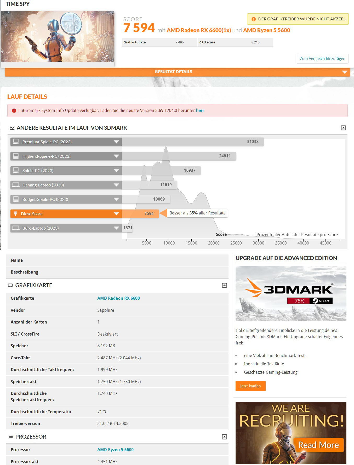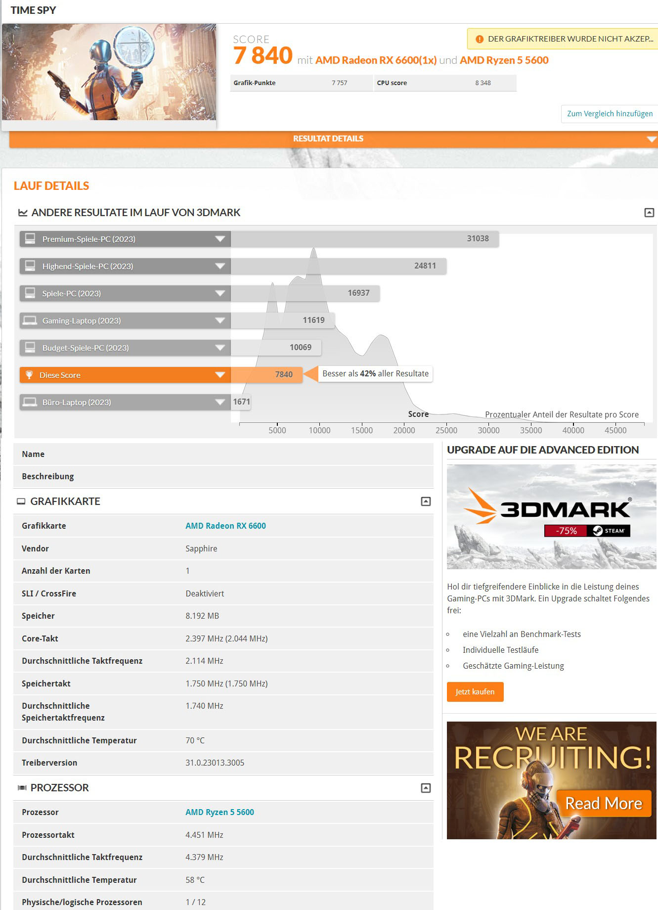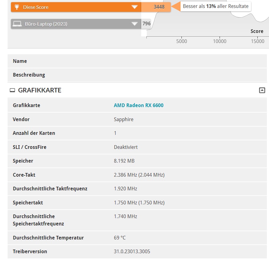 Ich habe mir bei Kleinanzeigen diese Grafikkarte (Sapphire Pulse Radeon RX 6600) gekauft, jetzt habe ein Benchmark mit 3D Mark gemacht, von den Punkten her weicht sie etwas ab, kann mir einer von Euch sagen, ob das normal ist oder ob die Grafikkarte eventuell einen Defekt hat.