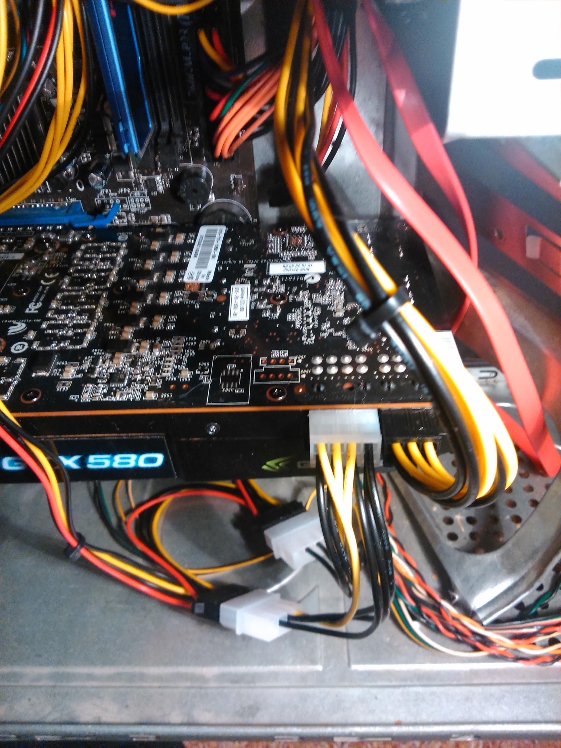 Mein Kumpel hat mir gesagt wie ich das Testen kann.Jetzt werden einige denken ich bin bekloppt aber in dem Moment war ich ein wenig angepisst.Er sagte schließe während des Laufenden betriebes den 6 Pol raus.Was ich auch gemacht habe.und siehe Bildschirm ging aus.Und der Lüfter der Grafikkarte lief dann.die macht ganz schön Wind.