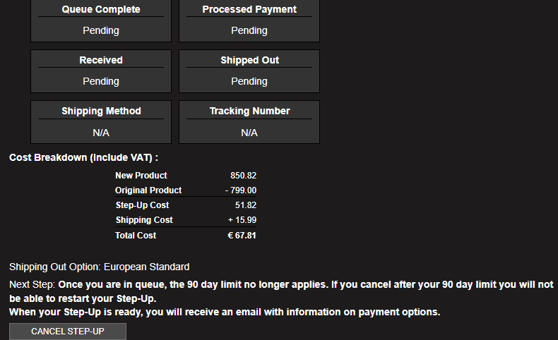 Möchten Sie dann weiterhin auf das ursprünglich beantragte Modell warten oder sollen wir Ihr Step-Up vollständig stornieren?