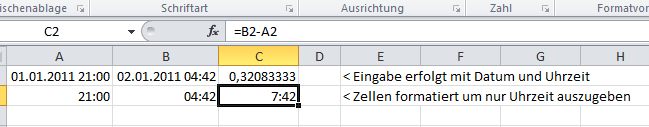 Ansonsten musst du selbst prüfen, ob bspw. die End-Zeit kleiner ist, als die Anfangs-Zeit und dementsprechend rechnen. Quasi: