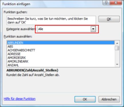 Es erscheint ein Fenster, wo du in der Liste Alle auswählst. Dann siehst du alle Funktionen, die Excel bereithält