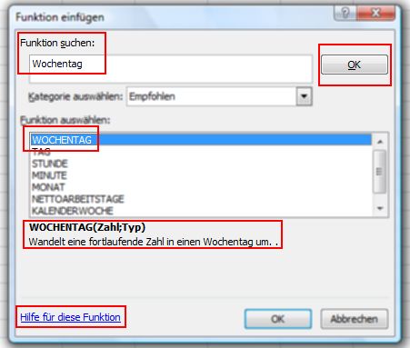 Übrigens, wenn du wie oben beschrieben die Funktionsliste über fx aufrufst und mal bei Funktion suchen: einfach Wochentag eintippst und dann auf Suchen (oder OK oder Start) klickst, findest du auch die Wochentags-Funktion. Und darunter eine kurze Beschreibung zur Funktion und ganz unten im Fenster kannst du auch die ausführliche Hilfe zu jeder Funktion aufrufen. Dort wird jedes Argument erklärt und du findest mehrere Zahlenbeispiele zu der Funktion.
