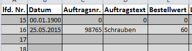Das Problem ist nun, dass wenn jetzt in das Dokument die nächste lfd. Nummer eingetragen wird, in meiner Tabelle folglich die Zeile vorher gelöscht bzw. mit 0 in jeder Zelle angezeigt wird. Ich denke es gibt viele Wege dies zu verhindern z.B. Funktion nur einmalig ausführen, Inhalte der Zellen speichern etc.....