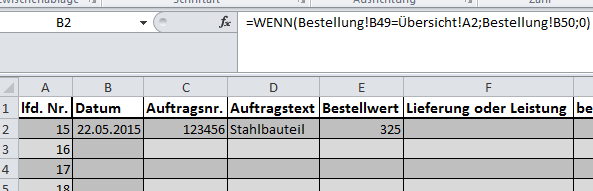 Nun habe ich eine Übersicht erstellt in der wie zu sehen ebenfalls eine laufende Nummer enthalten ist. Wenn ich nun mein Bestellformular ausfülle und die laufende Nummer des Bestellformulars mit der Zeile der Übersicht übereinstimmt (mit wenn-Funktion gelöst) sollen die anderen Inhalte des Bestellformulars wie Auftragsnummer, Datum, Bestellwert etc in meine Übersicht automatisch eingetragen werden. Das funktioniert auch soweit. Jetzt ist das Problem, dass wenn ich in das selbe Bestellformular für meine nächste Bestellung verwende und folglich sich der Inhalt und natürlich auch die laufende Nummer ändert, sich in meiner Übersicht zwar die Inhalte der neuen laufenden Nummer aktualisieren (wie oben beschrieben) nur die Inhalte der vorherigen wieder weg sind. Wie kann ich das Problem lösen?