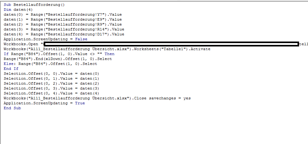 Application.ScreenUpdating = False 'schaltet die Bildschirmaktualisierung aus'