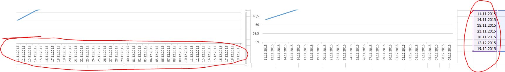Ich habe mir eine EXCEL Tabelle mit Daten erstellt und auch passende Diagramme dazu. Allerdings habe Ich nur 5 Daten die Ich als Datum übernehmen möchte und nicht die Daten zwischendrin, da diese das Diagramm nur unübersichtlicher machen...
