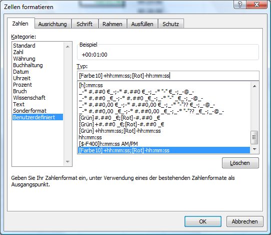Zellenformat: [Farbe10][>0]+hh:mm:ss;[Rot][<0]-hh:mm:ss;[Schwarz]hh:mm:ss