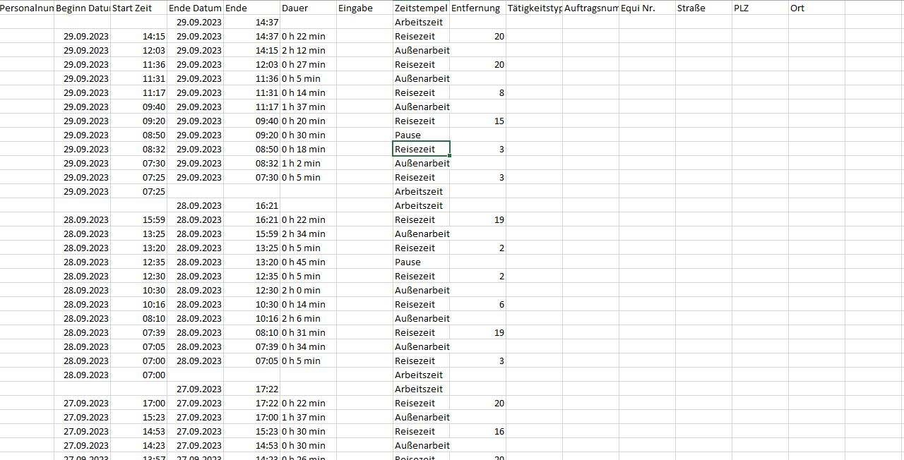 Datum Anfangszeit Endzeit Dauer (alle) Dauer (nur relevante) Art der Taetigkeit