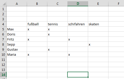 Wie kann ich eine Liste aus der Matrix retour geben, wo er mir alle Namen auswirft, bei denen in Spalte 1 (Fußball) ein "x" ist?