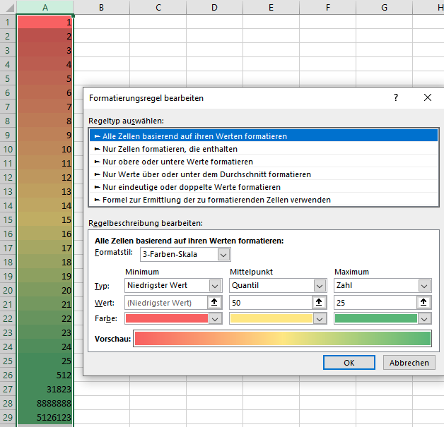 Folgender Sachverhalt: ich habe eine Tabelle mit einer Spalte in der Zahlen aufsteigend sortiert sind, diese sind durch eine bedingte Formatierung farblich, je höher die Zahl ist umso mehr gehts ins Rote.