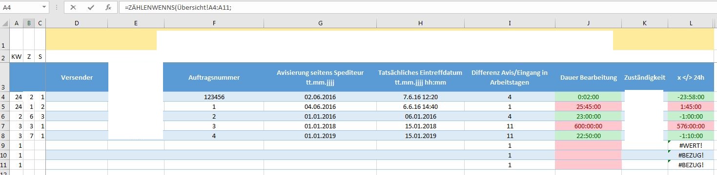 Soll nun in Zelle B2 die absolute Anzahl an Aufträgen in dieser KW automatisch angezeigt werden. Sprich, ich habe in KW 24 10 Aufträge, soll dies in B2 automatisch angezeigt werden. Code ZÄHLENWENN funktioniert nicht.