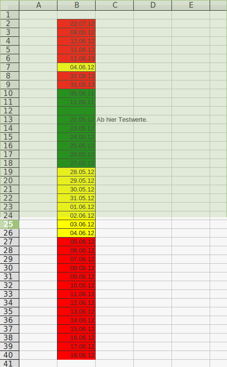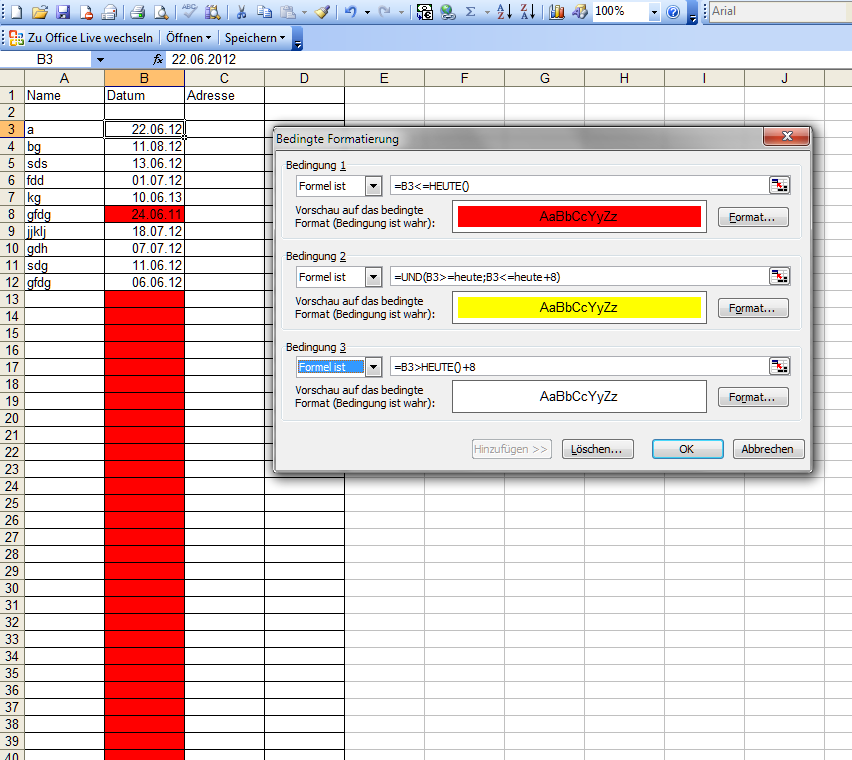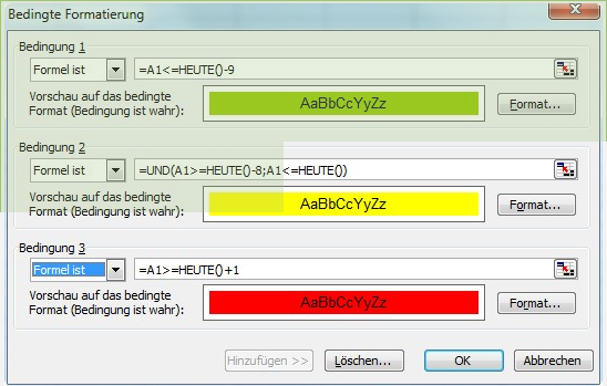 Nun fügst Du auf gleiche Weise eine 3. Bedingung hinzu (Button Hinzufügen). Wieder "Formel ist", dann im Feld eintragen: "=b2>heute()+8" wieder Buchstabe für Buchstabe so wie hier ohne die Anführungszeichen. Dann setzt Du für diese Bedingung (Du bist immer noch in dem Dialog "Bedingte Formatierung" für die Zelle B2!) das Format mit grünem Hintergrund.