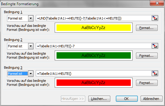 Dann hast Du die Möglichkeit, mehrere Formatierungsbedingungen für diese eine Zelle anzugeben nach dem Schema "Wenn das und das so ist, dann formatier die Zelle so und so".
