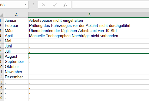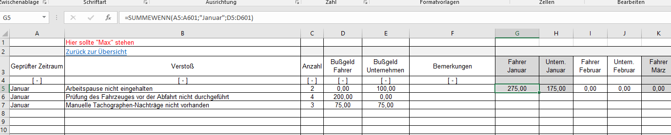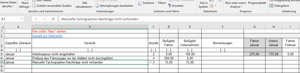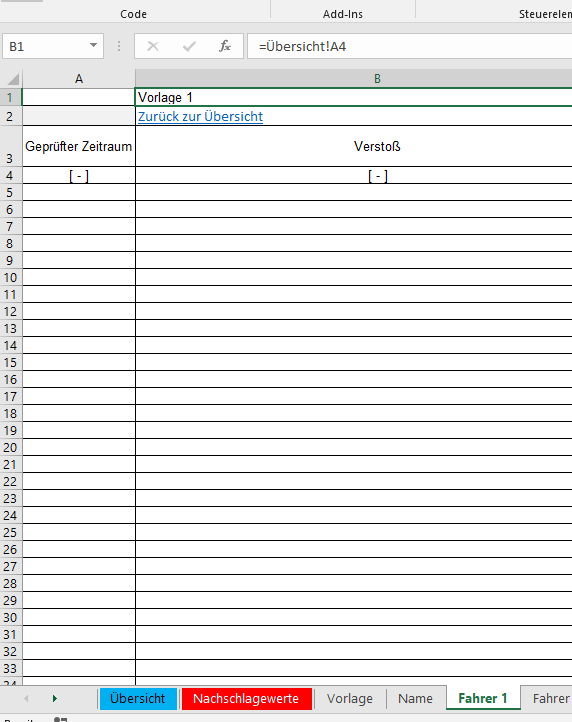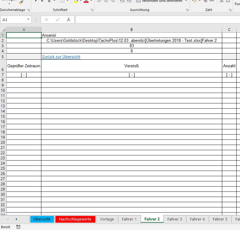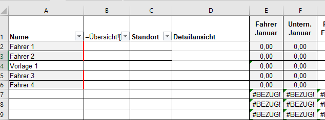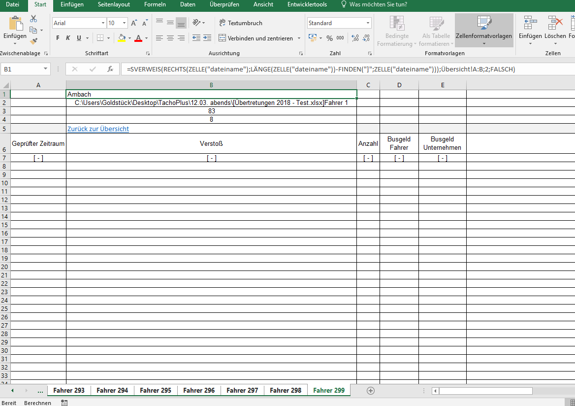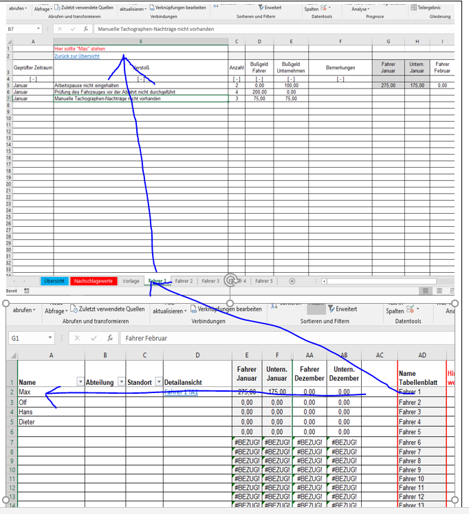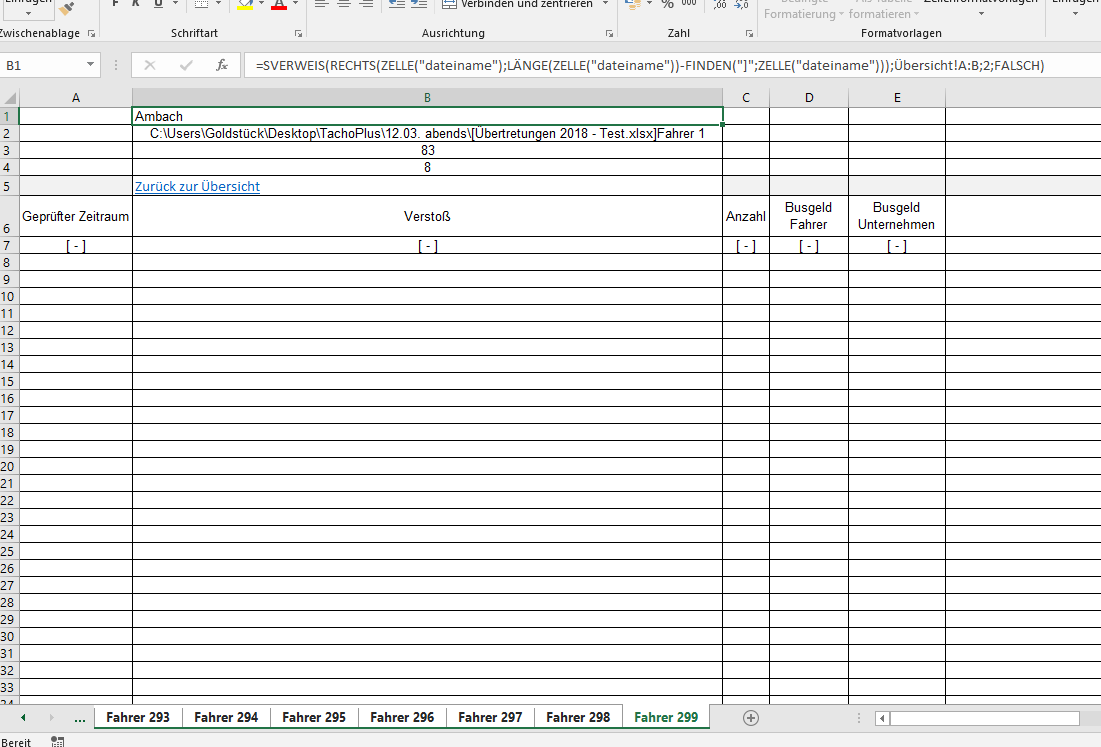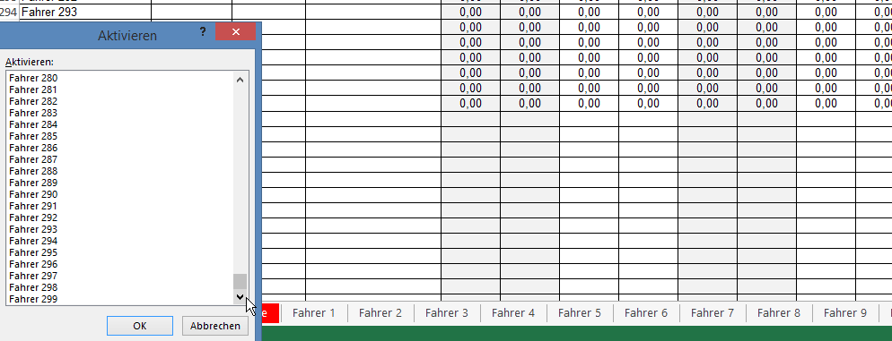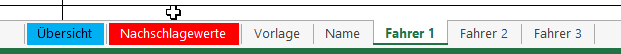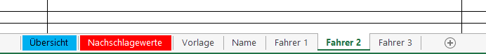 Namen der Tabellenblätter: Fahrer 1, Fahrer 2, etc.