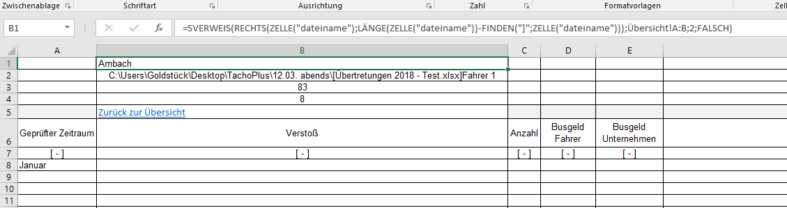 Füge in "B1" des Blattes "Fahrer 1" den Namen ein, der in Spalte "A2" steht.
