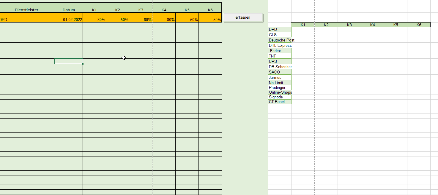 A2 ist der Dienstleister und B2 dann das Datum, diese Felder müssen in die Tabelle immer übertragen werden, auch immer danach in die nächste Zeile springen zum einfügen. Also Prüfung ob Zeile leer ist.