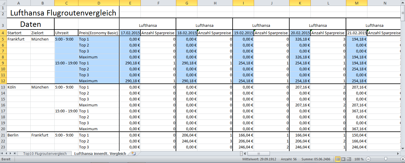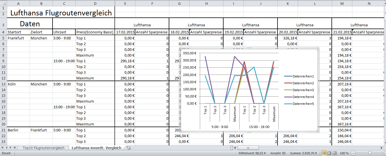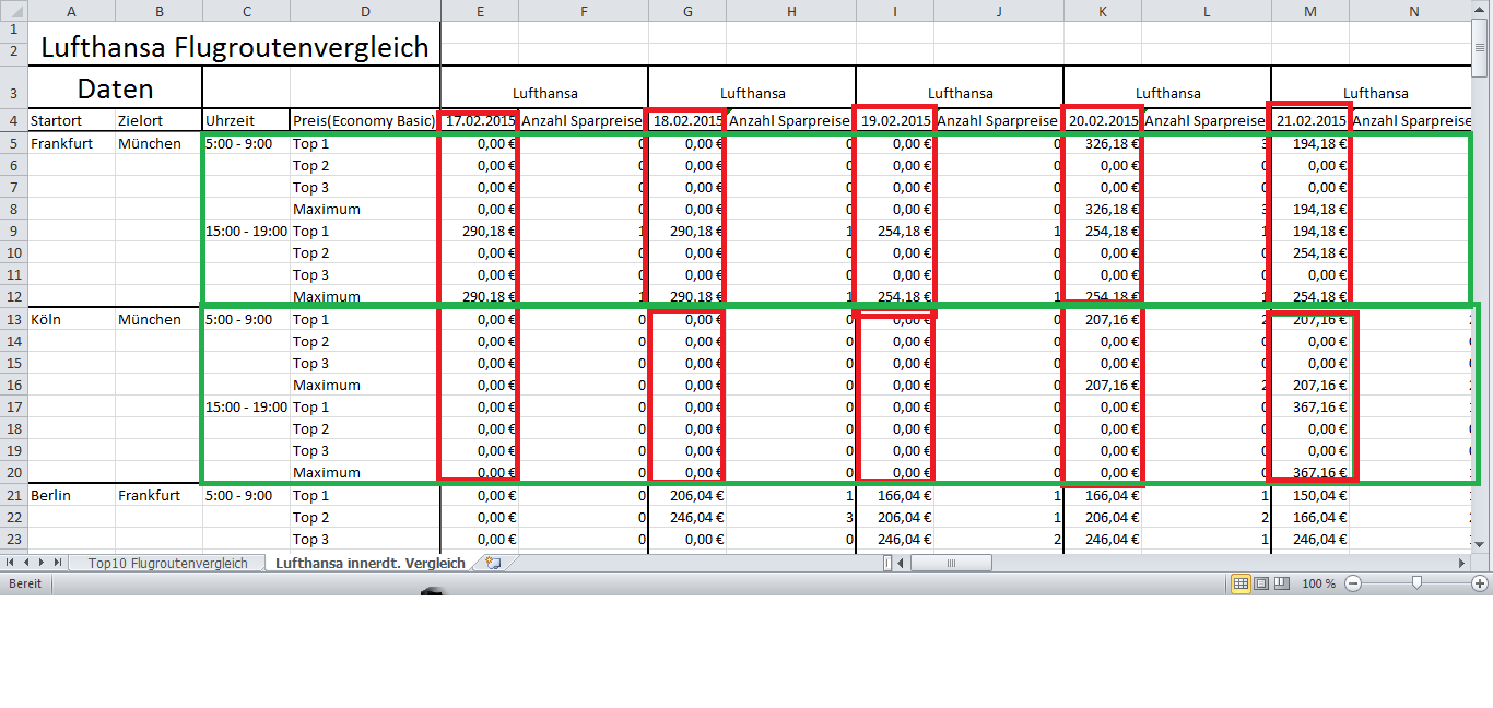 Wenn ich das richtig sehe, enthält die Datentabelle eine Vielzahl an unnötigen Informationen. Die Verbindungen, die Uhrzeit, Maximum und die Anzahl der Sparpreise spielen eigentlich keine Rolle. Zumindest nicht für die Tabelle. Also sind diese Informationen nur vorhanden, damit man selbst die Übersicht hat.