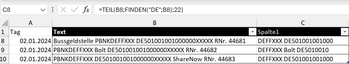 Wie kann ich in Excel die IBAN Nummer beginnend mit DE... aus dem Verwendungszweck in eine extra Spalte extrahieren?