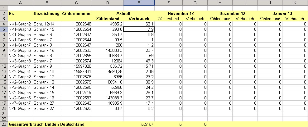 Und Zwar habe ich zwei Tabellen, in der einen habe ich in Abhängigkeit des heutigen Datums eine Monatsangabe, unter dieser ein Gesamtergebnis aus der zweiten Tabelle entnommen werden soll. In der zweiten habe ich von mehreren Zählern einen monatlichen Verbrauch der zusammen gezählt wird.