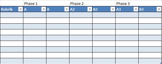ich habe eine Tabelle aufgelistet: Horizontaler Überschrift: Phase 1, Phase2 unsw. Darunter ein zweiter Überschrift mit 2 Abteilungen: