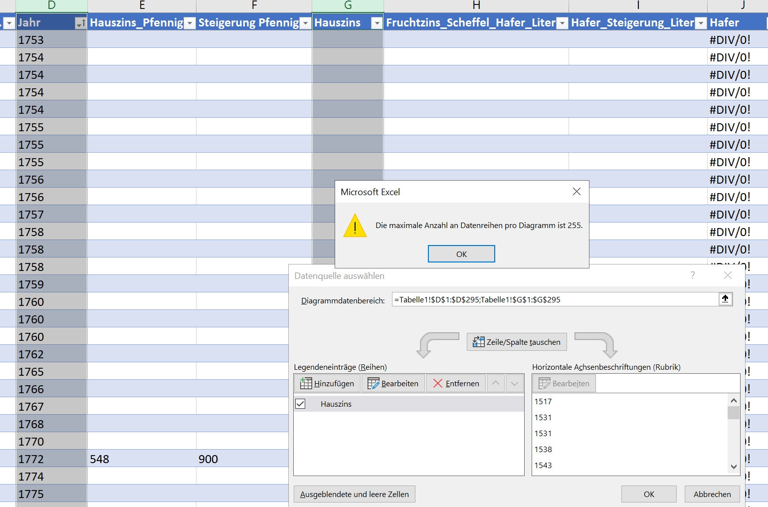 Diese Werte habe ich als "intelligente Tabelle" angelegt, da ich verschiedene Werte vereinheitlicht umrechnen muss (mittelalterliche Geldwerte z.B.). Bis vor einem halben Jahr etwa konnte ich daraus eine Statistik machen. Jetzt zeigt es mir aber plötzlich keine Jahresangaben an der unteren Scala mehr an, sondern nur noch solche 50er Schritte. Also anstatt das Jahr 1520 z.B . 50, 100 , 150. Und zwar in jeder Statistikart. Die Jahreszahl als "Zahl" zu formatieren funktioniert bei Excel leider nur bis zum 1900 zurück. Das Mittelalter wird hier nicht akzeptiert. Aber es hatte ja schonmal funktioniert. Ich weiß leider nicht, ob ich da was falsch eingestellt haben könnte.