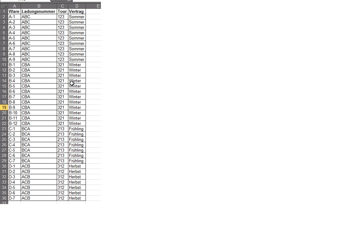 Ist es nun möglich, für die im Anhang dargestellte Tabelle, ein Makro zu schreiben, welches alle Waren, die zu einer Tour gehören, automatisch in einer neuen Datei abzuspeichern, die mit dem Namen der Tour benannt wird?