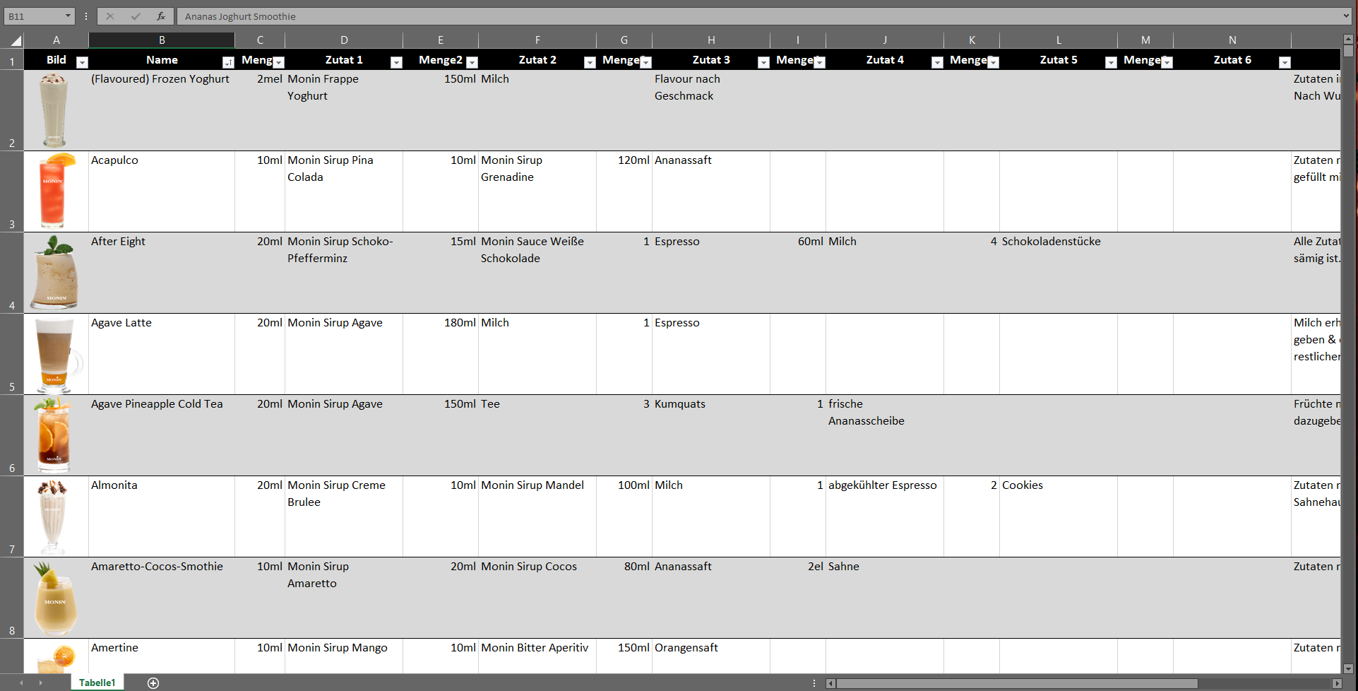 Hab mir über das Internet verschiedene Mocktails zusammen gesucht und die Zutaten bzw. Zubereitung in eine Tabelle geschmissen. Ziel ist es nun zu filtern, welche dieser Mocktails ich anhand der Zutaten die ich Zuhause habe, zubereiten kann.