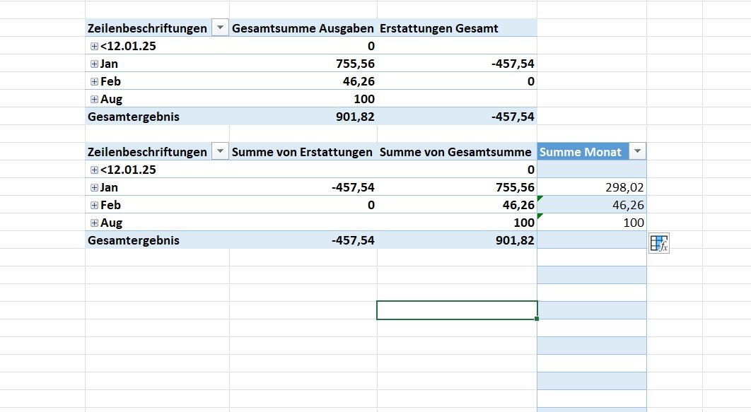 so ist schon in die richtige Richtung, leider werden die Erstattungen nicht von den Ausgaben passend zum Monat abgezogen und Aktualisieren tut sich die Pivot auch nicht