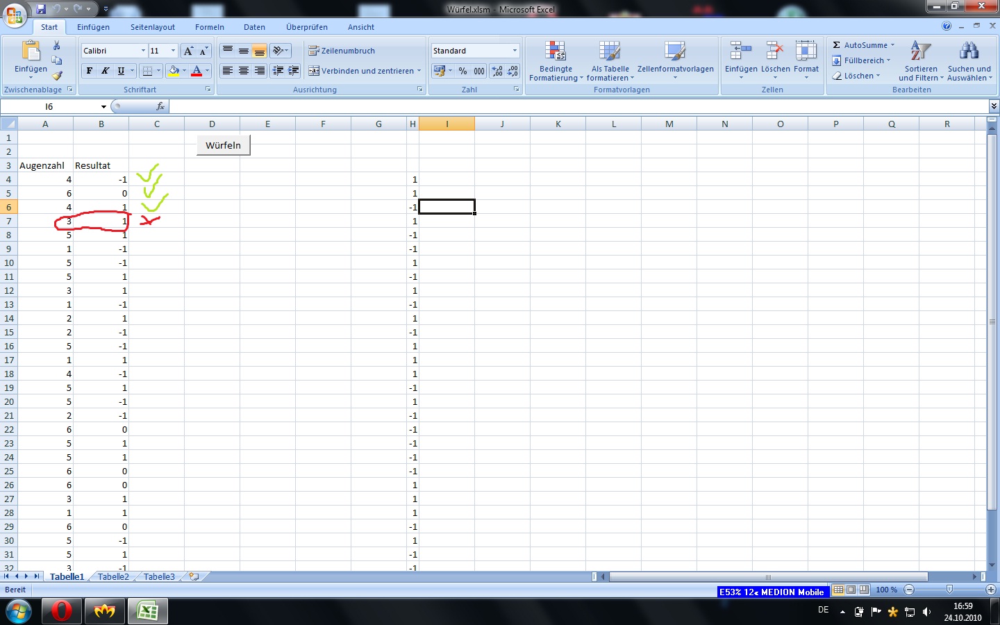 In einer Spalte werden Zufallszahlen von 1-6 generiert. Bei 1,2 und 3 soll dann wo anders ein +1 stehen und bei 4,5 und 6 ein -1. Soweit kein Problem.