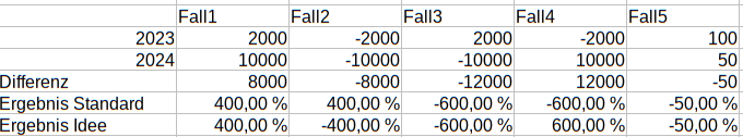 Absurd wird es zb. dann, wenn man für 2023 1 Euro und für 2024 -10000 Euro einträgt. Ergebnis -100,01%. Das würde man in der aktuellen Darstellung eben als 1,0001€ Unterschied interpretieren und das ist doch quatsch. Der eine Euro passt glaub ich etwas öfter als 1,01x in die 10000.