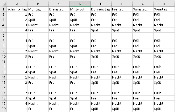 Wir haben eine 35 Stunden Woche und arbeiten von Mo bis Fr. Aufgrund eines hohen Auftragsbestandes wollen wir für ca. 6 Monate auch an Samstagen und Sonntagen in einem drei Schicht System arbeiten.