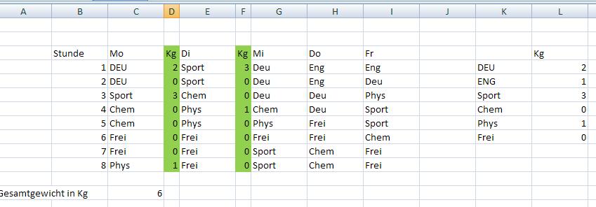 Nun habe ich jedoch das Problem, dass wenn der Stundenplan ein Fach mehrmals enthält das Gewicht auch mehrmals gezählt wird. Also z.B. bei einer Doppelstunde Deutsch wird das Gewicht für Deutsch doppelt gezählt. Dies ist natürlich nicht nötig da man in beiden Stunden das selbe Material braucht.