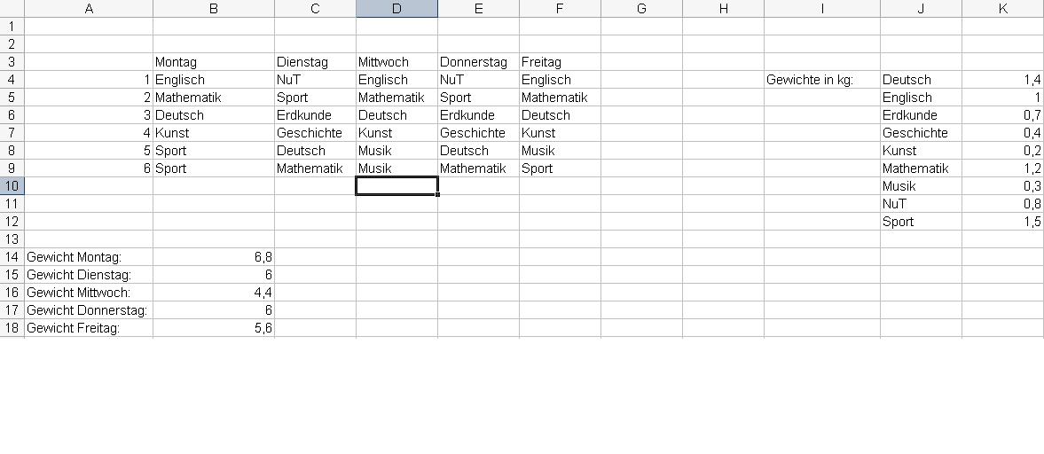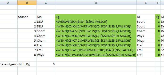 Es geht darum das Gewicht einer Büchertasche anhand des Stundenplanes zu berechnen. Habe den Stundenplan und die Gewichte der Matrialien für die einzelnen Fächer. Diese Gewichte stehen alphabetisch geordnet in einer Tabelle.