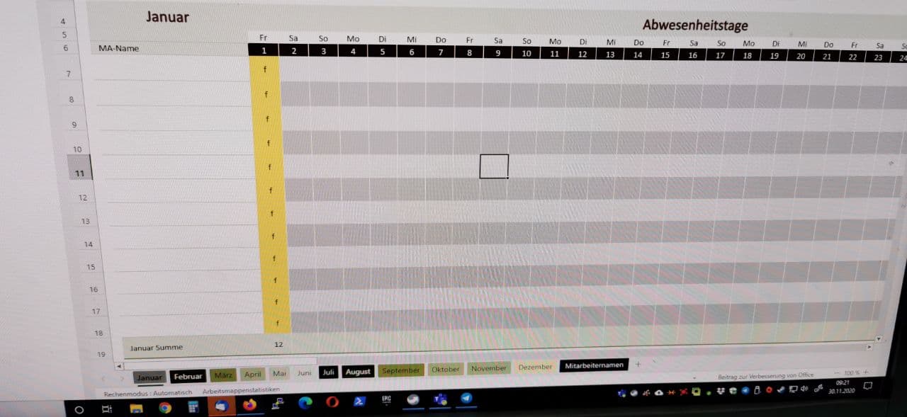 wir haben einen Urlaubsplan. Da sind unten in den Tabs die weiligen Monate und dann wählt man seinen Namem in Spalte B und trägt dann in den Urlaubstagen jeweils ein "u" ein .