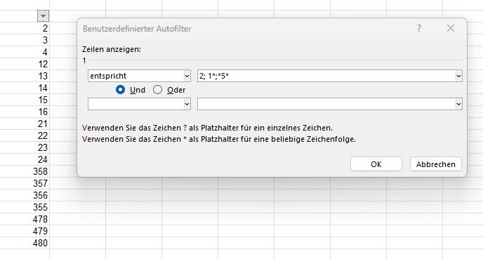 - ich habe einen Excelsheet mit Postleitzahlen. Jetzt möchte ich einzelne Postleitzahlen raus filtern, was einfach wäre, wenn ich einfach nur nach den Anfangszahlen selektieren wollte (Häckchen raus oder rein). Da ich aber selektierter vorgehen muss, bin ich auf den Textfilter gestoßen: UND / ODER. Mein Problem: ich brauche hier mehr als nur 2 Werte...