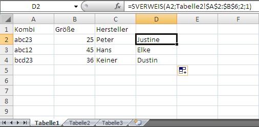 Ich habe zwei Excel-Tabellen auf 2 Sheets. In Tabelle 1 sind verschiedenste Zahlen- und Buchstabenkombinationen, hinter denen dann Hersteller, Größe usw. stehen.