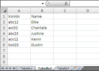 In Tabelle zwei stehen genau diese Zahlen- und Buchstabenkombinationen, nur in anderer Reihenfolge und in einem noch größeren, aber irrelevanten Umfang. Hinter der Kombination steht dann der Name des Artikels, was in Tabelle 1 nicht der Fall ist. Genau dieser Name soll aber passend zu der Zahlen- und Buchstabenkombination in Tabelle 1 automatisch in einer weiteren Zeile eingefügt werden.
