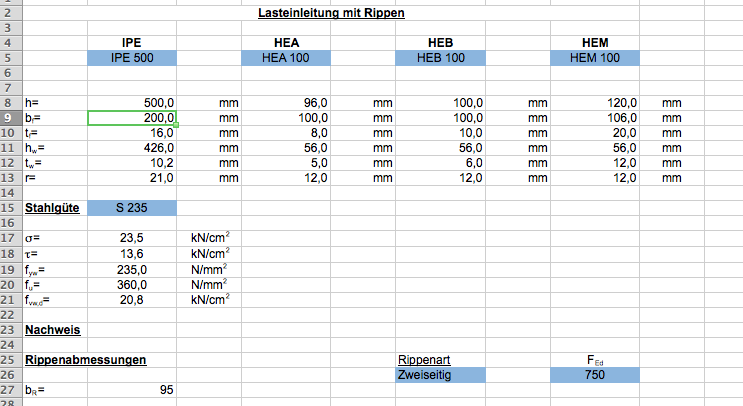 In vier nebeneinander liegenden Zellen habe ich verschiedene Werte in einer Drop-Down-Auswahl hinterlegt (verschiedene I-Profile im Stahlbau IPE; HEA; HEB; HEM). Zu diesen Werten gehören nun noch Querschnittswerte, die darunter aufgeführt werden und sich automatisch ändern, je nach Profilwahl.