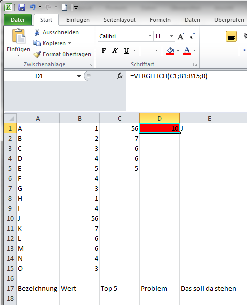 In Zelle C1 bis C5 werden nun die 5 größten Werte ausgegeben.