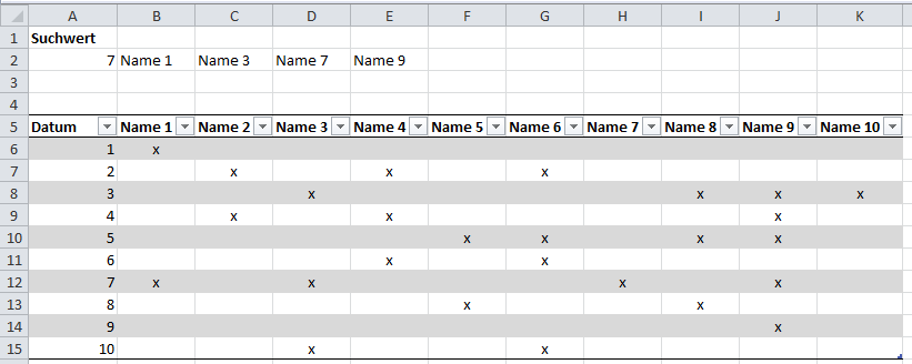 Wiedergegeben werden soll aber nur ein Wert, wenn der "Marker", in diesem Falle "X" auch wirklich in der durchsuchten Zeile steht