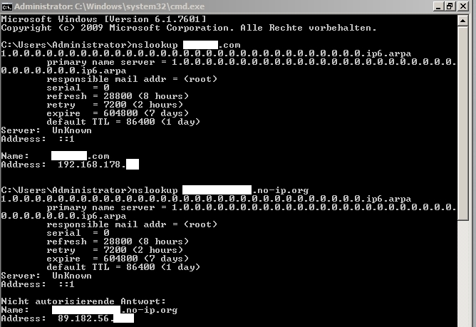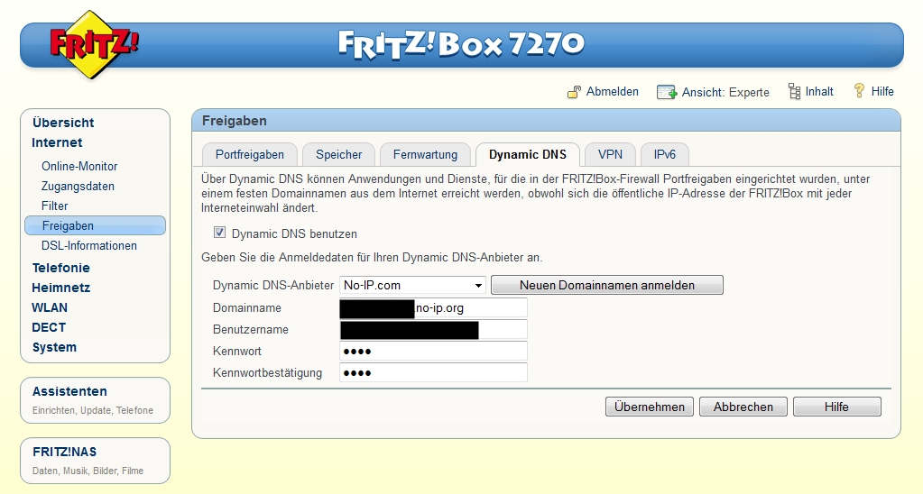 1. Einen Free-Account bei http://www.no-ip.com/ für Dynamic DNS angelegt. Dann habe ich meinem Account einen neuen Host " bspw.no-ip.org " mit dem Hosttypen " DNS(A) " hinzugefügt. Dann habe ich deren Clienten " DUC " auf meinem Server installiert, mich angemeldet und den Host dort ausgewählt.