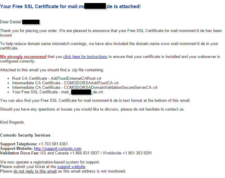 Da ich aber die Zertifikatswarnungen nicht möchte bin ich beim durchstöbern auf den Anbieter InstantSSL gestoßen. Dort habe ich die CSR eingefügt und mithilfe der Bestätigungs E-Mail an meine Domain verifiziert.