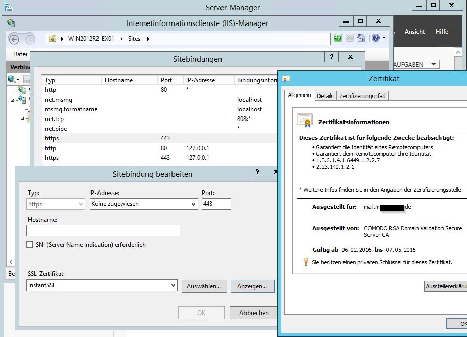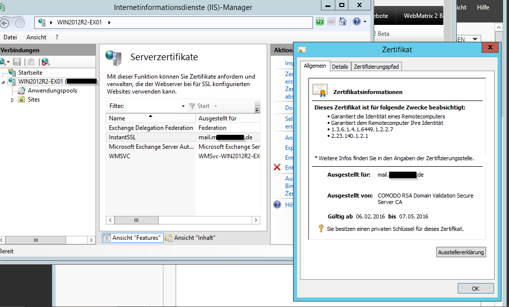 Anfangs hatte ich mir ein selbst erstelltes Zertifikat und einer Zertifizierungsstelle installiert. Dies hat ohne große Probleme funktioniert.
