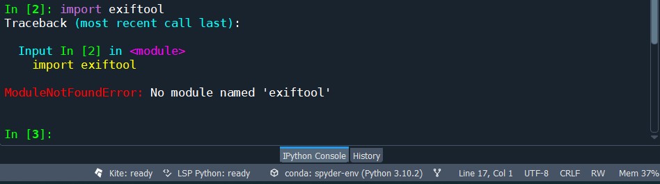 4. Ich geben in die Spyder-Konsole "import exiftool" ein und er bringt mir leider immer noch den Fehler