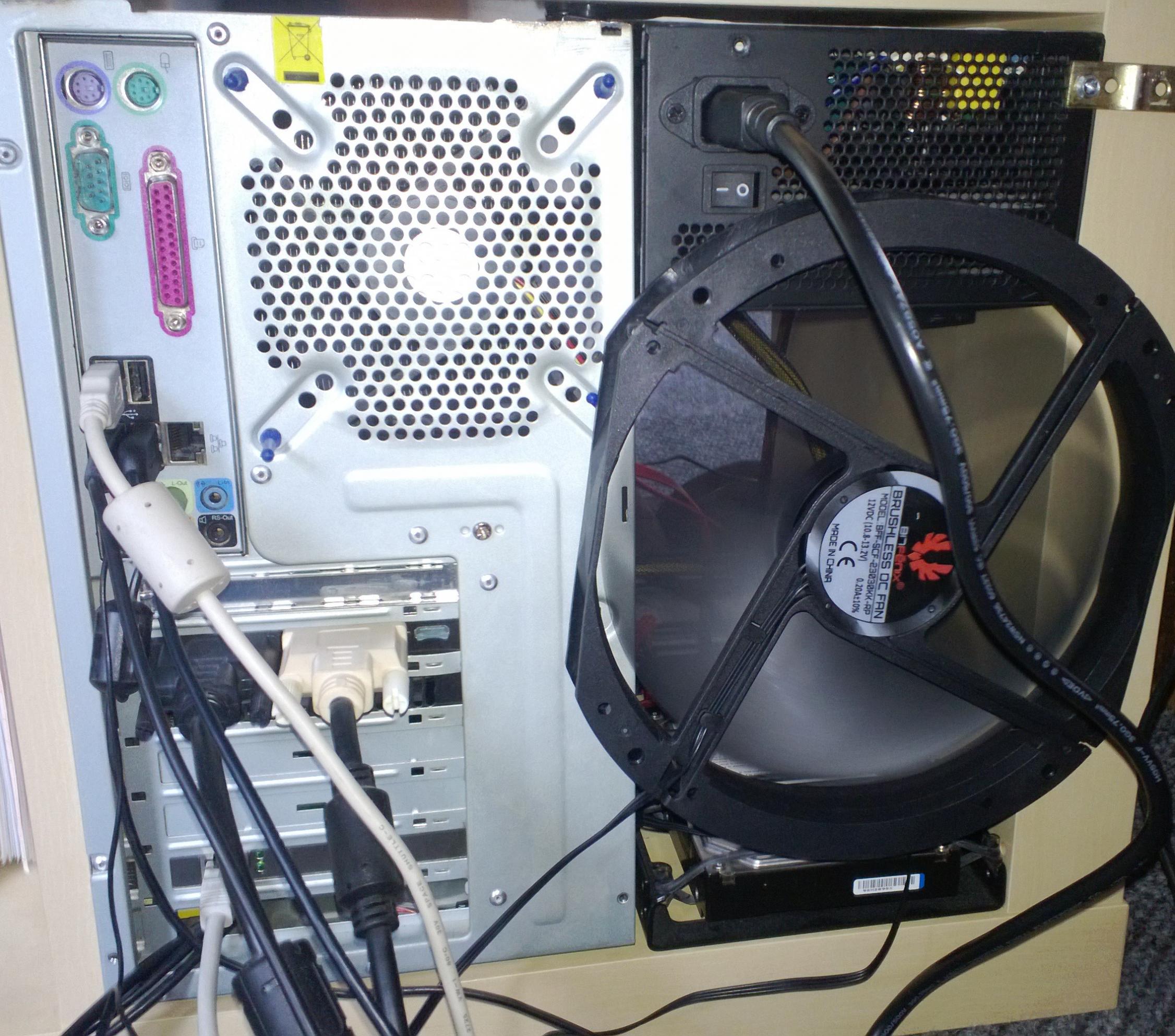Ein altes Gehäuse auf die Innenmaße des Regals geflext um erstmal auszuprobieren wie es sich mit der Hitzeentwicklung verhält. Dieses samt Netzteil und Festplatten provisorisch eingebaut. Ergebnis: Temperaturen OK, aber da der "Gehäuserest" samt Mainboard aufrecht steht ist zwischen dem oberen Regalbrett und dem CPU Kühler (Arctic Freezer 2 oder so ähnlich) ziemlich wenig Platz. Das Regalbrett (ca. 10 - 12 mm stark) wird an der Oberseite schon ziemlich warm. Also muss das Ganze jetzt Waagerecht eingebaut werden.