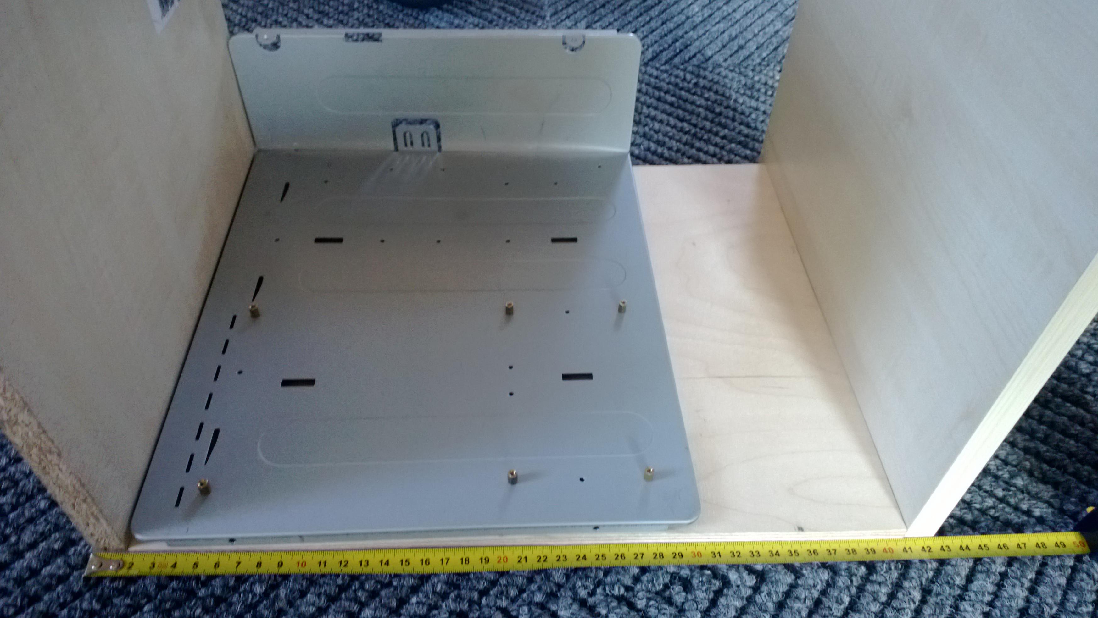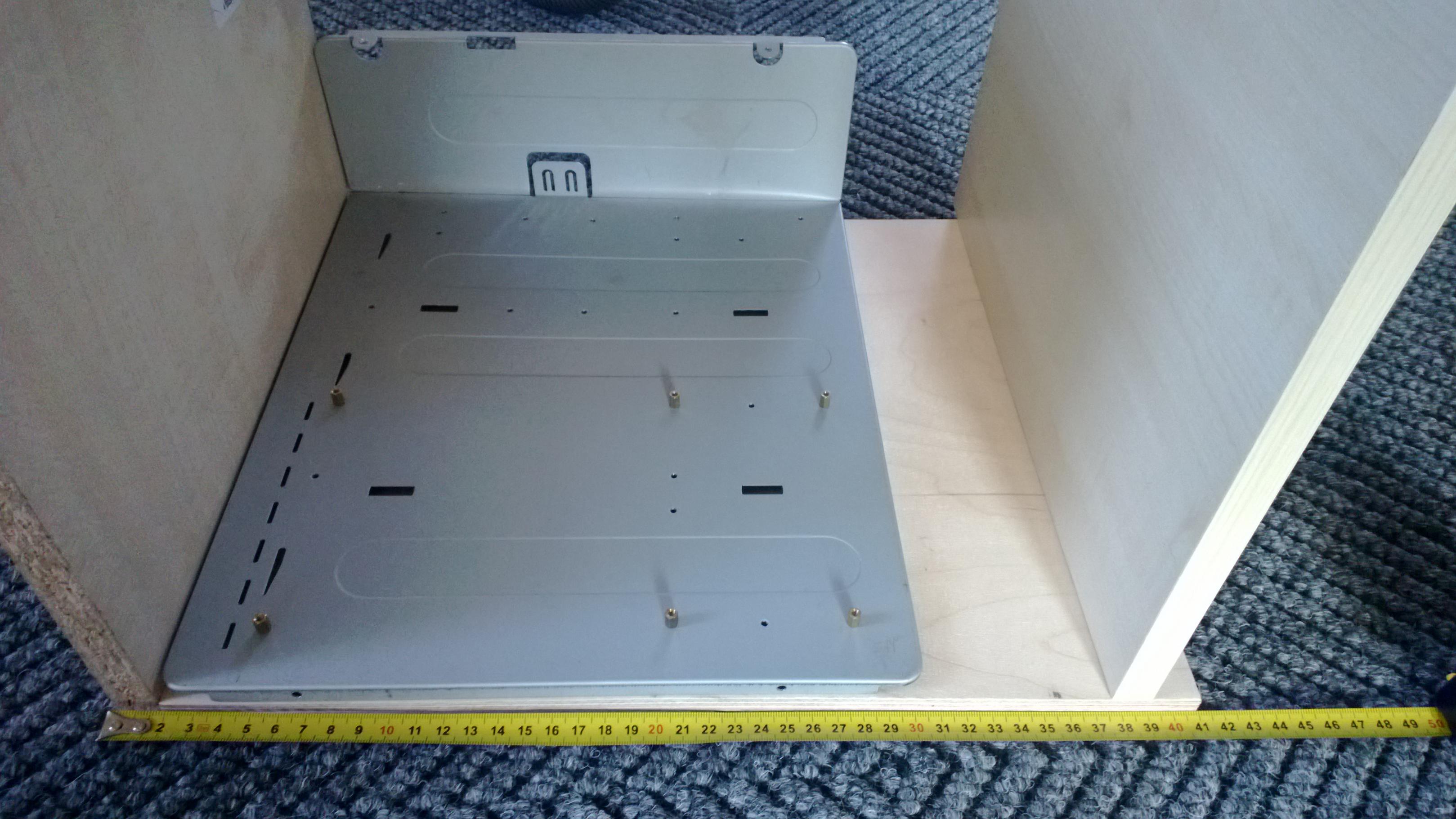 Zum Thema Festplatten habe ich aus den alten Gehäusen die Halterungen für 5,25 Zoll Laufwerke rausgenommen und überlege nun wo ich die am sinnvollsten unterbringe... Auf der Schublage geht nicht, da das Regal knappe 39 cm tief ist und der MB Träger 28,5 cm davon belegt (+ 2x12mm Vorder und Rückwandverkleidungen) da bleibt nicht mehr viel Über als entweder der Schublade auf der Seite wo das Netzteil hinkommt noch eine Seitenwand zu verpassen und die Halterung hinterm Netzteil an die Seitenwand anzubringen... (5,25 Zoll wegen der Vibefixer. Die will ich auf jeden fall behalten)