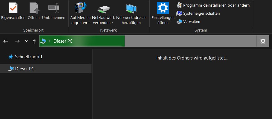 Interessant ist auch: Schaut Euch mal den Datei Explorer an: Links die Schnell-Leiste (zu favorisierten Ordnern z.B.) ist leer und "Dieser PC" zeigt gar nichts an. Windows lässt sich aber ansonsten normal bedienen, auch alle Festplatten sind komplett erreichbar, Dateien lassen sich öffnen, kein Problem.