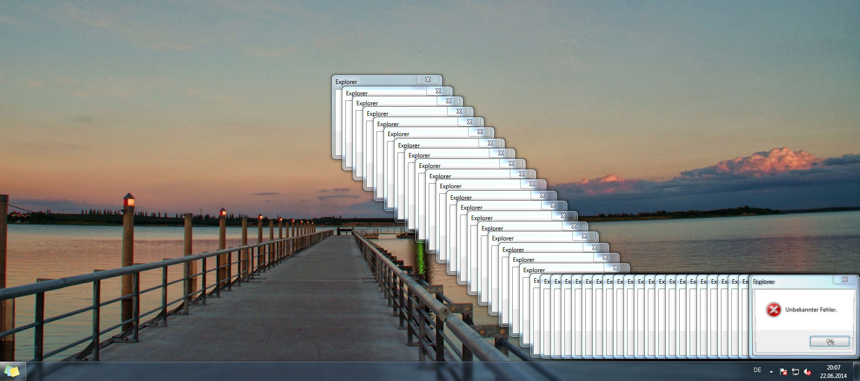 Ich habe folgendes Problem: Ab und zu bringt mein Windows folgende Fehlermeldung: Explorer: Unbekannter Fehler. Leider tut er das nicht nur ein Mal, sondern teilweise stundenlang öffnet sich ein Fehlerfenster nach dem anderen, jedes Mal mit einem hübschen "Dong". Manchmal hilft nur noch der Neustart, manchmal kommt dann nach 10 Minuten oder 2 Stunden "Windows Explorer funktioniert nicht mehr, Windows Explorer wird neu gestartet." Danach ist erstmal wieder alles gut. Aktiv kann ich es aber nicht beenden, dann öffnet sich sofort das nächste Fenster. Manchmal tritt es beim Musik hören auf, manchmal beim YouTube Videos schauen - es gibt also keinen bestimmten Auslöser dafür.