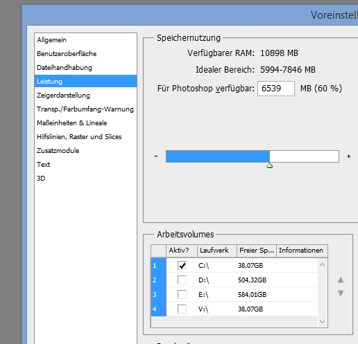 Was mir allerdings zu denken gibt. Ich bin Fotografin und arbeite viel mit Photoshop. An manchen Tagen bekomme ich dort beim Speichern meiner Bilder auch Fehlermeldungen wie "Das Bild konnte nicht gespeichert werden, da das Arbeitsvolume nicht ausreicht" oder ". . . da nicht genügend RAM zur Verfügung steht". Ein Blick auf die CPU zeigt aber eine Auslastung von 1-5% und der Arbeitsspeicher steht bei ca 1GB. Dann hilft nur der Neustart und die Fotobearbeitung kann weitergehen. Programme wie Photoshop, Videobearbeitung und Spiele laufen allerdings flüssig.