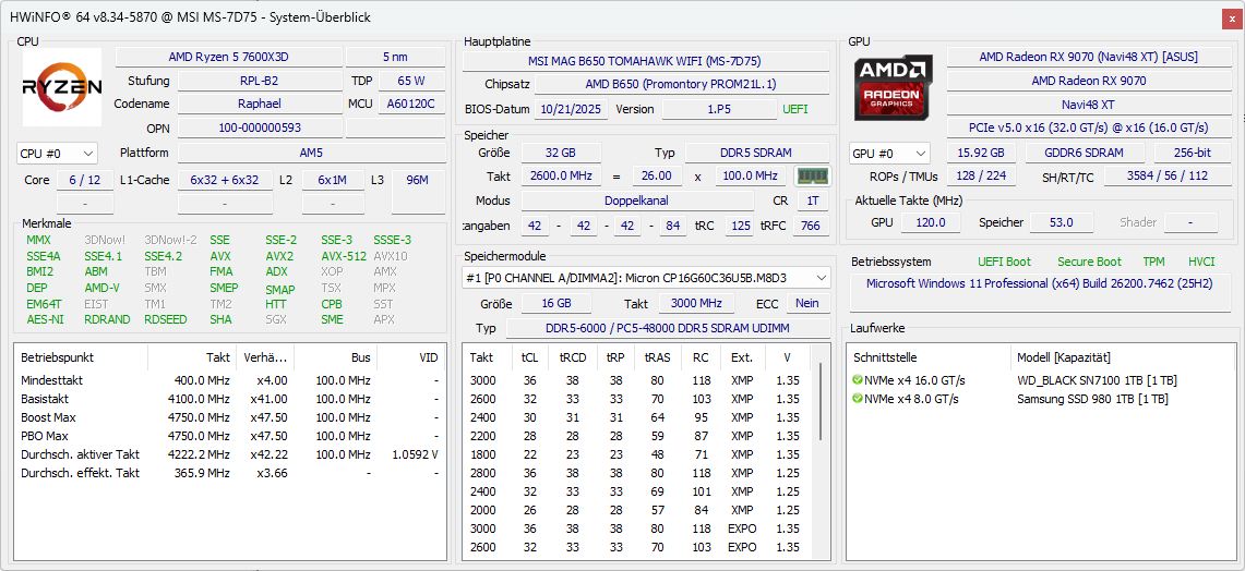 Ich habe ein MSI B650 Tomahawk WiFi Mainboard und dazu den Crucial Pro DDR5 RAM 32GB Kit (2x16GB) 6000MHz CL36 (CP2K16G60C36U5B). Ich kann im BIOS auch die entsprechenden EXPO Profile aktivieren (Profil1 = 5600 und Profil2 = 6000) und so wie es scheint laufen die RAM Riegel dann auch mit der entsprechenden Taktfrequenz.